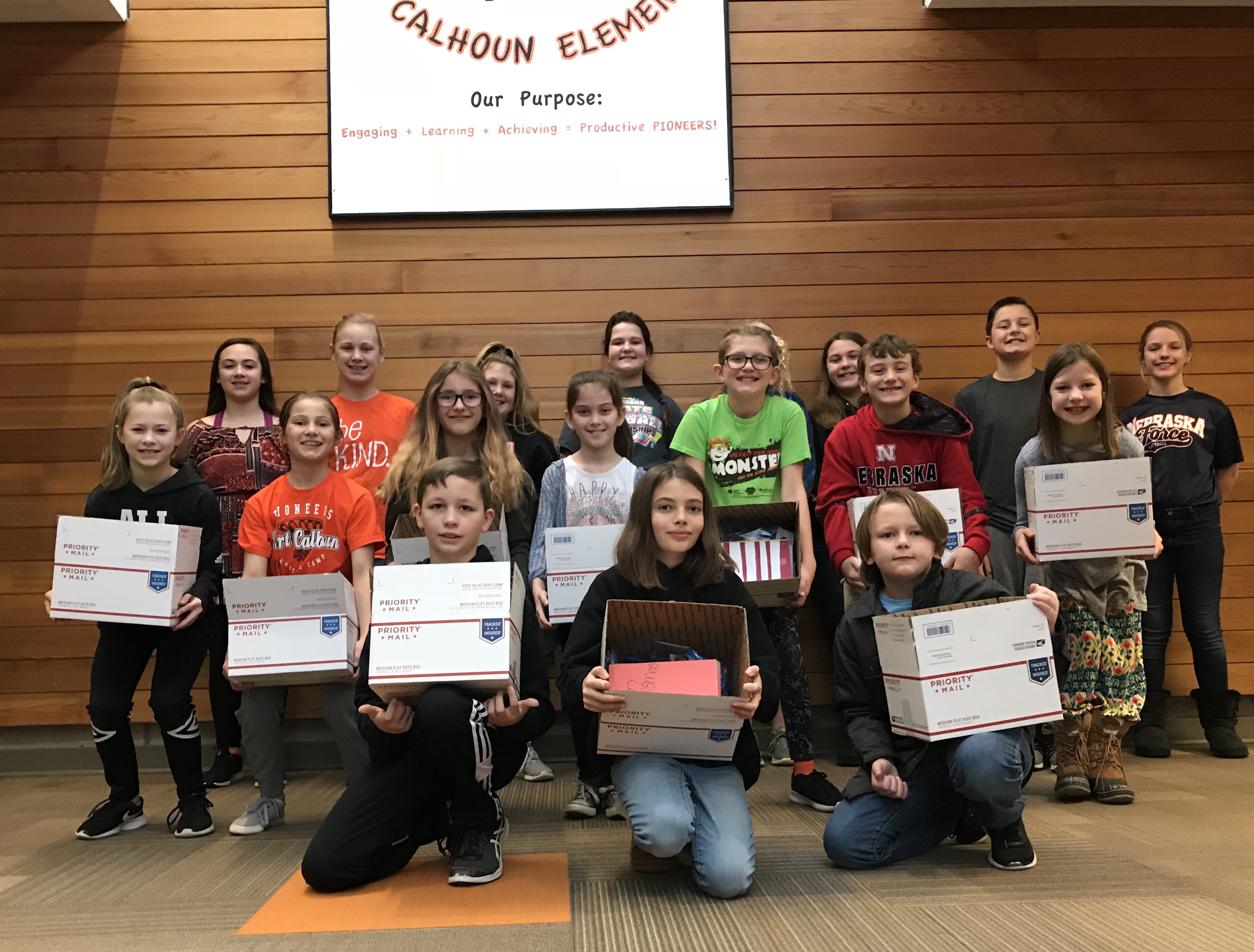 Fort Calhoun Elementary Student Council Members sent care packages to troops overseas. The packages included snacks, bubble gum, and mints. They also added holiday cards that students in the school made. They were so grateful this year for monetary donations from the VFW, the Jaycees and the Knights of Columbus here in Fort Calhoun which made this possible. Such a great community we live in. Student Council Members are as follows.