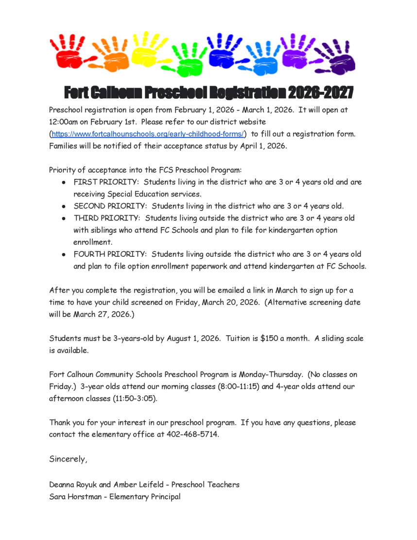 Preschool registration is open from February 1, 2026, to March 1, 2026. It will open at 12:00 AM on February 1st, and the link to the registration form will not be open until then. Any form submitted before that time will not be accepted. Please see the flyer for more information. If you have any questions, contact the Elementary office at 402-468-5714.
