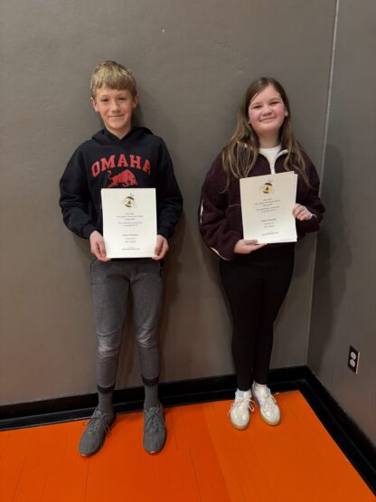 Congratulations to our local Spelling Bee winners. At the Elementary, we had Collin Sundermeier in 1st place and Claire Heneger as our runner-up. At the Junior High, our winner was Gabby Muse, and our runner-up was Sam Richardson. Wish them luck in the County Spelling Bee hosted by Blair School this year.